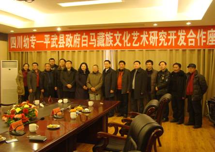 20101230,四川幼专赵波副校长带领学校科研处、白马藏族与羌族文化艺术研究中心一行人员赴平武县与平武县政府就研究与开发白马藏族文化产业召开座谈会。平武县委常委、宣传部长冯正碧,县人大副主任齐波,副县长李学义,副县长屈然斌及民宗局、文化旅游局、社科联、教育局、文化馆负责人参加会议。