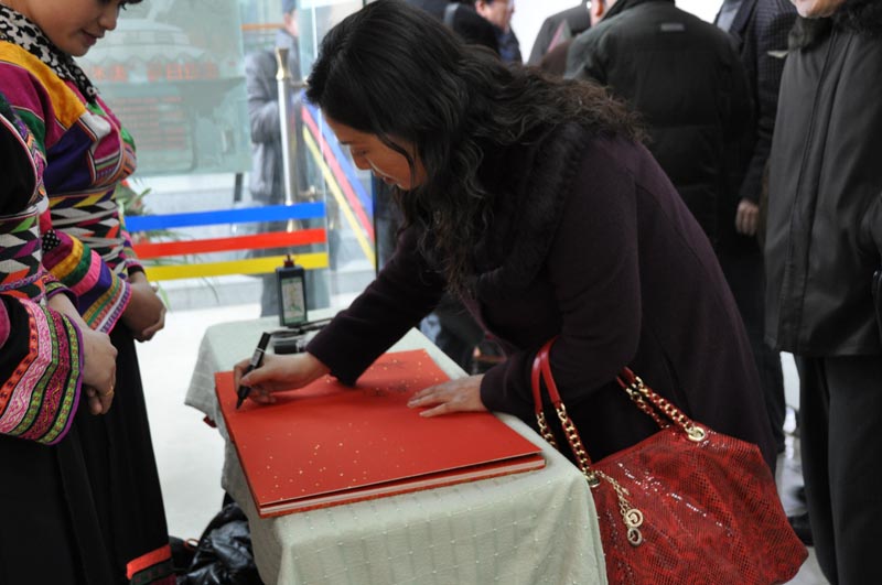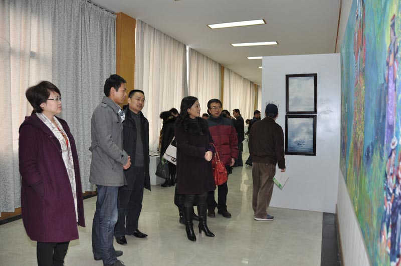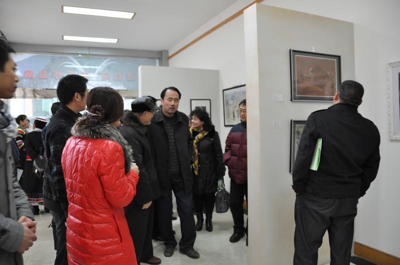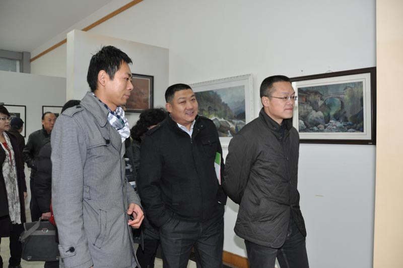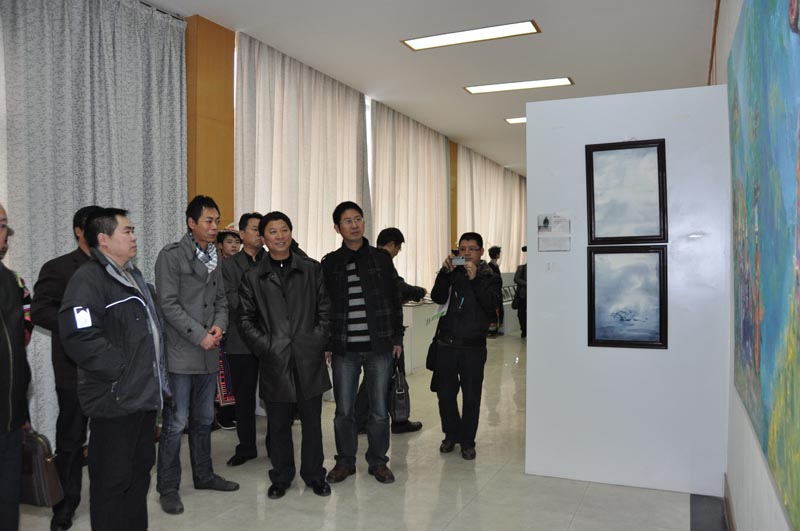 绵阳师范学院蒋志教授、江油市社科联主席蒲永见、绵阳师院音乐与表演学院肖萍院长等观看画展