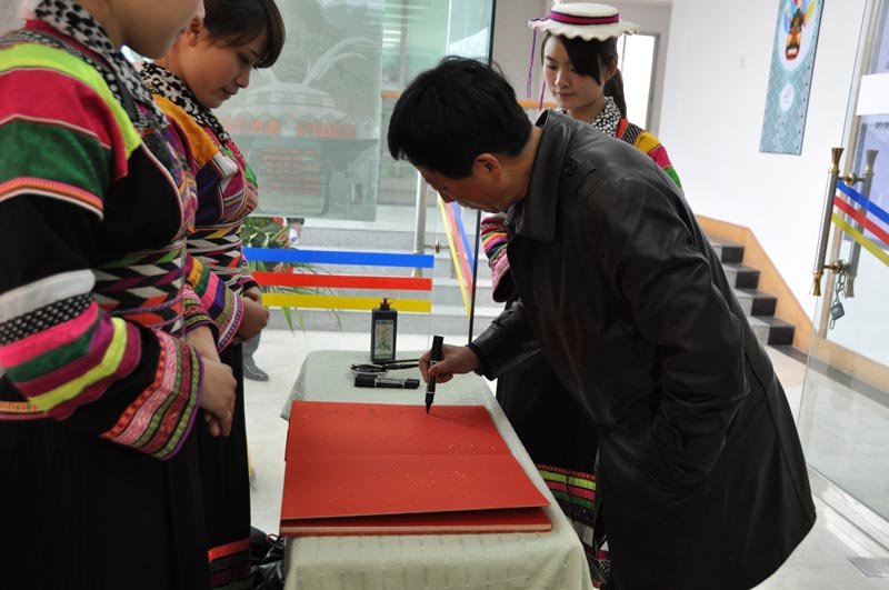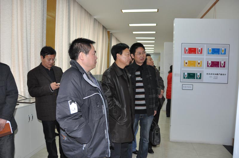 四川幼专罗长国校长、陇南师专司跃宁校长及绵阳社科联主席何季德一起欣赏白马文化创意设计作品