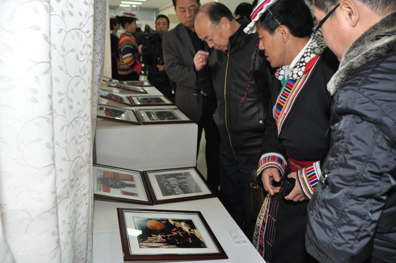 陇南白马人民俗研究协会秘书长丘雷生、副秘书长田佐、平武白马乡小学校长李光明观看摄影作品