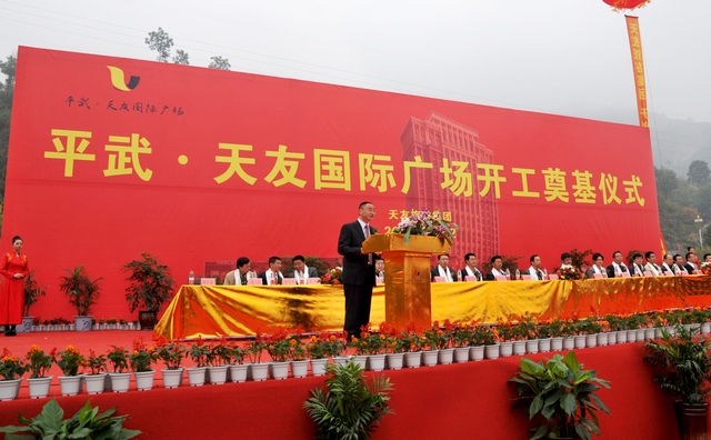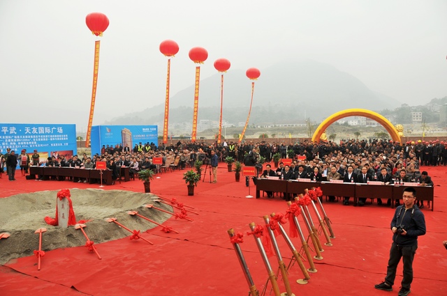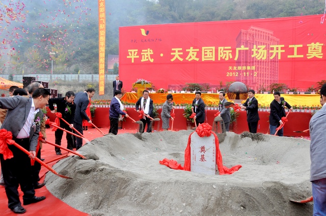 11月2日,由成都天友旅游集团投资开发的平武县天友国际广场在龙安镇举行开工奠基仪式,平武县首个以购物、美食、娱乐、生活、休闲为一体的国际广场暨五星级国际酒店正式动工建设。