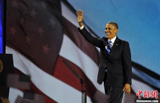2012年美国大选结果于当地时间11月7日凌晨出炉。奥巴马成功连任。图为奥巴马与在芝加哥举行的大选之夜晚会上向支持者挥手致意。中新社发 毛建军 摄