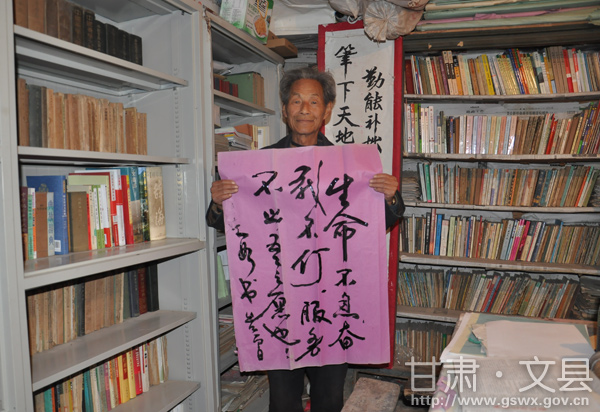 走进张老自办的文化大院,两间瓦房打扫的窗明几净,不染尘垢。书架上3000多本书籍归类摆放,井然有序。墙上贴满了张老的书画作品,“一息尚存献丹诚”、“生命不息,奋斗不停,服务不止”等条幅吸引了记者,这应该就是支撑张老一直走下去的动力之所在吧。