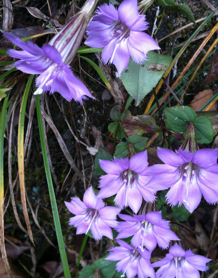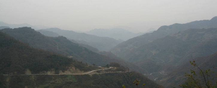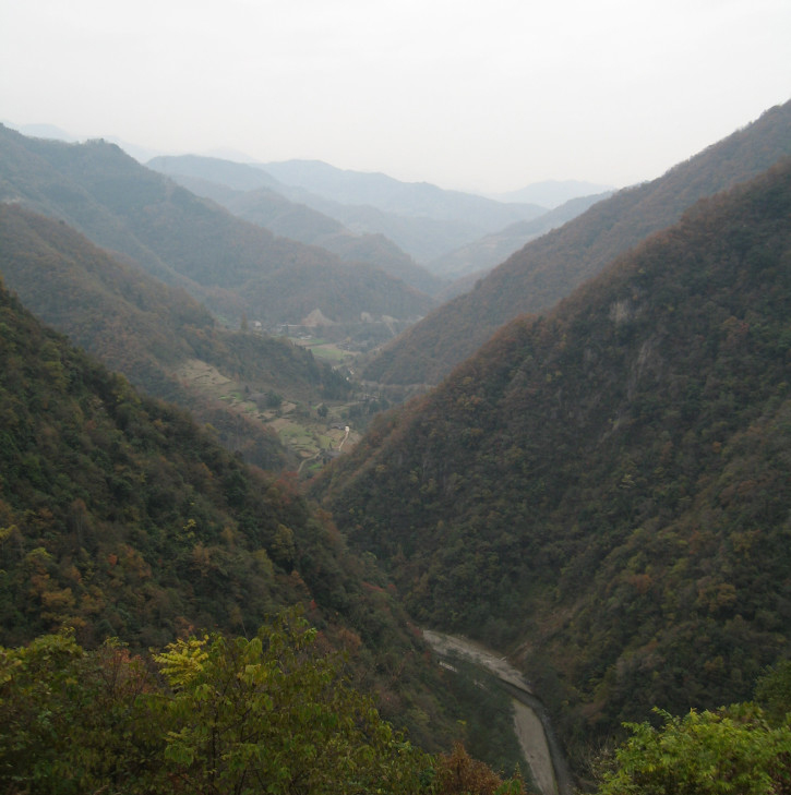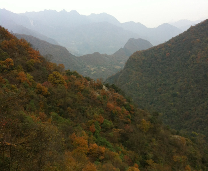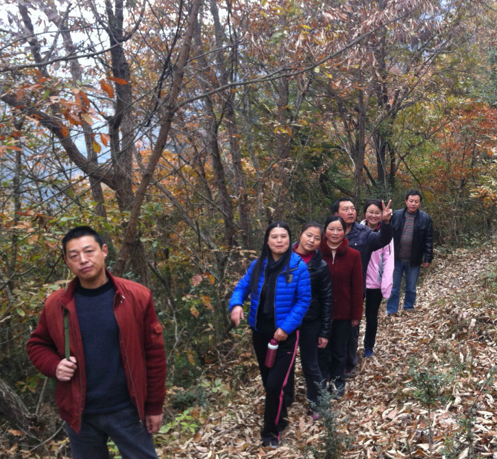这周末(周六),我们三家半人约了去宝竹岭。我创意,老丁邀约。有老丁家三口(他侄女丁凤),小郝家二口,老谭家独一口,我们家两口,共八口。约的早上八点半在东风路口碰头,然后坐车到义佛山。结果上车已经九点过了,到达义佛山山顶快十点。站在义佛山顶,看东边是大水涪江,看西边是小水关东水。美中不足的是能见度不高,山水都罩着薄雾。山顶风不大,但奇冷。我虽已是第三次上到山顶,但依旧兴奋,一路拖在后面拍照。义佛山那边便是旧堡羌族乡的关东水。站在义佛山往西看,看见的是关东水的来路,一条溪,夹在极深的山涧里,蜿蜒东去、北转,溪河之上是重重的山垭,下面是坡度不等的山地山林,上面是万古老林。