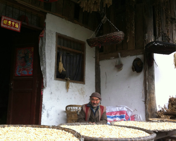 我们走过青杠叶铺成的山道,走过枫香叶铺成的山道,再走过板栗树叶和千丈树叶铺成的山道,才走出老林来到一户人家。几条狗叫了几遍山,一直叫到我们经过它们面前。几条黑狗,黑山狗,想必也从未见过世面,甚至连同基因也不曾见过世面,叫声还如同我四十年前听见的。这户人家叫杜家院,主人在门前街沿下面切洋芋,他认得老丁和丁凤。我注意到了后门外面那堆老南瓜,看上去黄酥酥的,想必吃起一定又面又甜。几十年没有这样去感觉山里人的生活了,屋里烤疙瘩火的老人,手里端一个瓷盅盅,盅盅上的瓷已经脱得差不多了。屋檐下还坐着个老人,穿着青丹布长衣,头上抱着黑帕,抱着杆长烟袋正吃着水烟。看见他们,我便忘了自己所处的世纪。山里无世纪,不知毛邓,更不晓得江胡习。这样多好,时间多圆满,生生死死即是永恒。