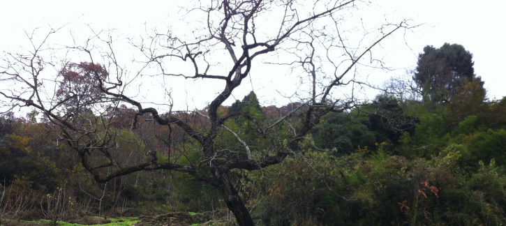 土地庙过去三个湾,在一个山嘴经过一个老屋基,满地石板石条,还有半截断墙,墙缝的蕨苗还是青油油的。某人站在墙上叫我给拍了张片片。老屋基背后林边也有一棵大树;旁边还有一棵门针刺树被砍得只剩下少半,依然枝繁叶茂。刀口已陈旧,想必砍了已经几十年。后来听丁凤的父亲说,老屋基叫肖家疙瘩,曾经是所学校。也不知该写成“肖家疙瘩”还是“萧家疙瘩”。一所学校在林子里,两边数里不挨人户,当年的情景一定有几份浪漫几分恐惧。山里女子山里娃难听的读书声从树林传到对面山上耕地的人的耳朵里,不知是怎样的情形。