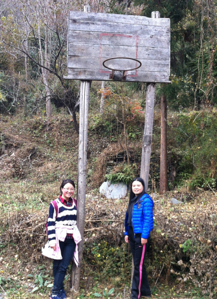 在另一户人家坎下的路边上,我们看见一所小学的篮球架,两根树棒棒撑着一块安着个铁圈圈的木板板。房子还在,学校撤了,勾子大一坨操场长满了草。