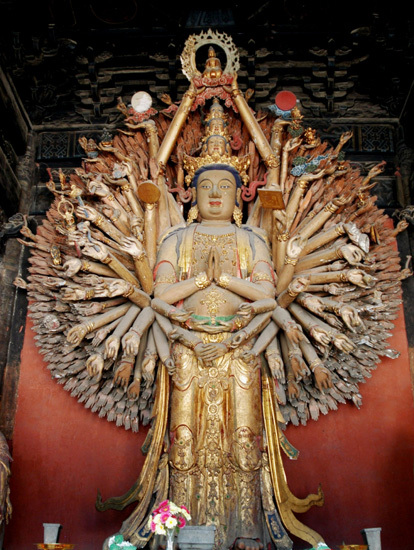 二是在大悲殿内有一尊气势庄严、灵验的千手观音,全身贴金,头戴宝冠,身披菁纱,璎珞垂地,赤双足,立于仰覆莲花宝座上,体态柔媚,高大匀称,正身以一根千年楠木精雕而成,高9米,身后呈扇形密布1004只手,这些手前后参差,左右环绕,上下重叠,互不遮掩,悬空排成15道圆孤,抬头凝望,婉如一朵巨大而怒放的金菊,千姿百态,美丽壮观。