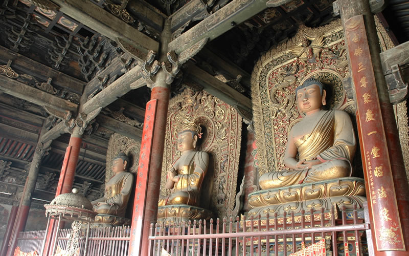 三是华严殿内巧夺天工的转轮经藏,高为11米,直径为7米,共分7层,形似一座七级佛塔。佛教认为:将它转动一圈,犹如念诵“六字”真言一遍,可消灾免难,延年益寿。它结构复杂,制作奇特,工艺精巧,雕饰繁杂,藏体上各种神像、木雕彩绘、佛像经典,都有很高的历史、艺术价值。为国内保存最好的一座。