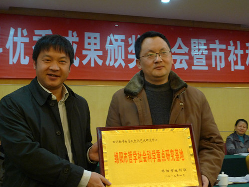会上,绵阳市社科联举行了“绵阳市哲学社会科学重点研究基地”授牌仪式,张学民向白马人文化艺术研究中心授予了“绵阳市哲学社会科学重点研究基地”的牌匾。