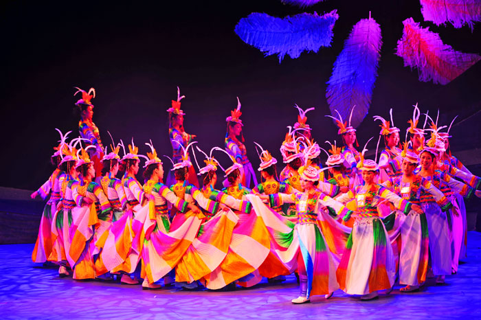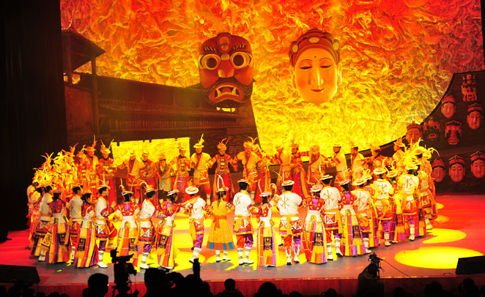 伴随着大型白马人民俗文化歌舞剧《白马•印记》的上演,开幕式进入了高潮。《白马•印记》以其独特的舞台背景,原始古朴的道具,绚丽多彩的民族服饰,风格迥异的舞姿征服了在场的所有观众。该剧共分序篇《古歌》、上篇《生命》、下篇《虔诚》、尾声《狂欢》四部分,演出以反映白马人历史文化为主线,用现代舞台表演艺术手法将传统歌舞元素进行提炼式的重构和创编,在还原白马人传统生产、生活、婚恋、宗教仪式场景的同时,以诗化的意境再现他们“人与自然和谐”的精神世界,在对生命的哲思氛围中,让观众全方位的感受这个古老而神秘的部族别样的魅力和不灭的灵魂。