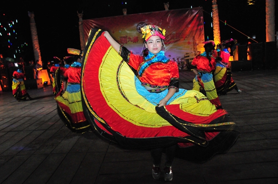 整台演出持续一个多小时,演员们一支支美轮美奂的舞蹈,一曲曲悠扬婉转的歌曲,几度掀起晚会现场的高潮,台上的演员演得卖力,台下的观众更是看得开心,笑声和掌声弥漫了着整个广场。就连前来旅游观光的游客也驻足调整手中相机的焦距频频按动快门拍照留影。