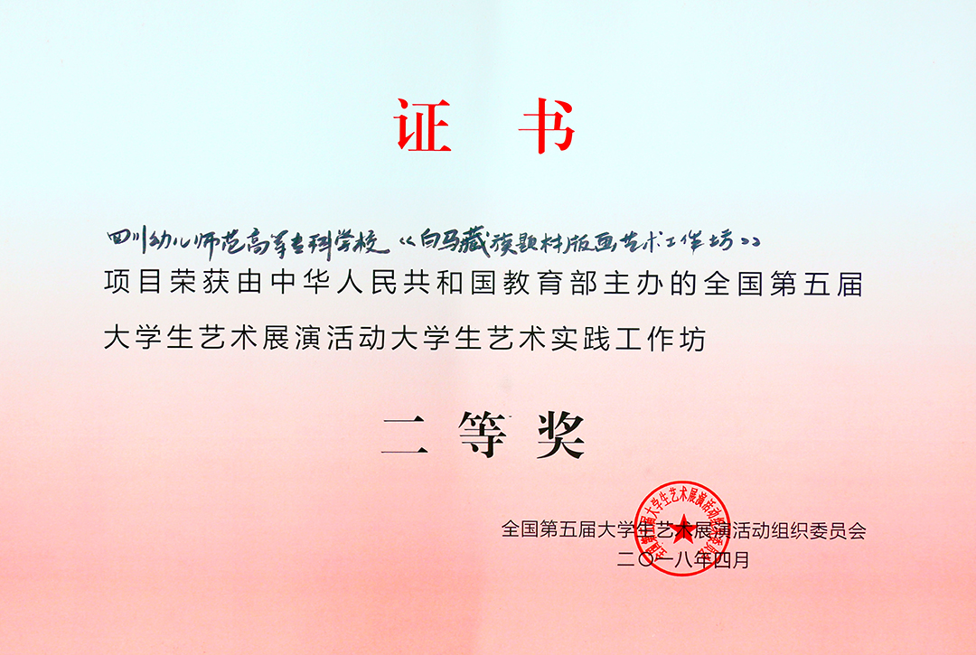 2018年4月,由教育部、上海市人民政府主办的全国第五届大学生艺术展演活动在上海举行。我校选送的 “白马藏族题材版画艺术工作坊”作为四川省选送的艺术作品之一,凭借独特的创新理念和形式美感在展演中大放异彩,获得全国第五届大学生艺术展演二等奖。