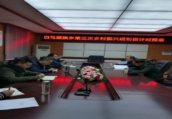 2019年11月27日,白马藏族乡班子成员与乡村规划设计师在乡政府二楼召开白马藏族乡第三次乡村振兴规划设计对接会。廖爱红书记会上强调白马乡村振兴致力于全域旅游,要做到农旅融合、康养融合。规划设计应考虑每个片区、每个寨子如何提升并融入白马元素、突出白马文化特色。
