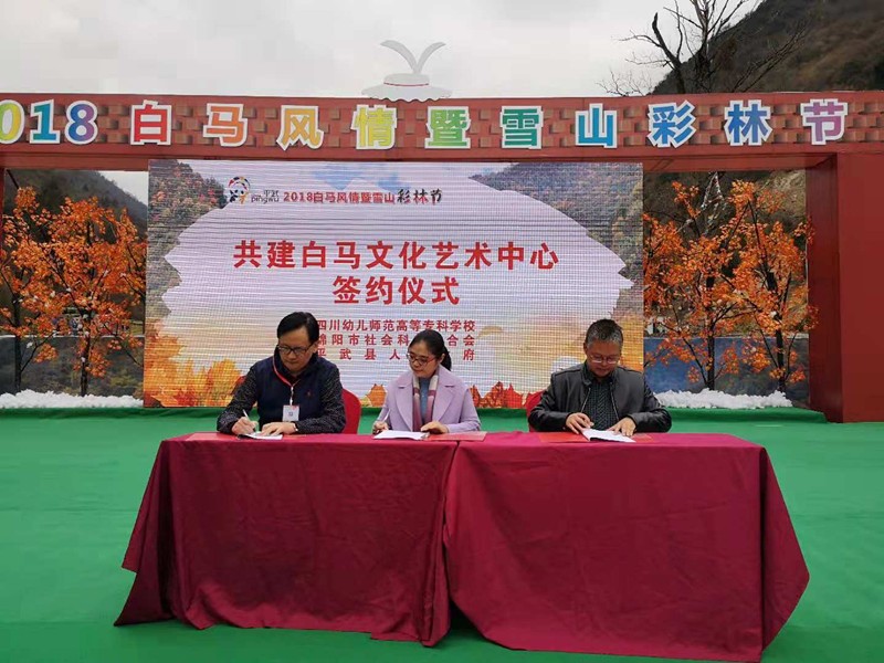 2018年11月3日,白马人文化艺术研究中心主任陈强、中心负责人冯作辉等应邀前往平武县白马藏区参加“2018白马风情暨雪山彩林节”。在活动中,四川幼专和平武县人民政府、绵阳市社会科学界联合会达成共识,签订合作框架协议共建白马人文化艺术研究中心。三方将按照“协同创新、产教研融合、优势互补、共赢发展”的原则,秉持“汇聚专业人才、深化科研教学工作、传承创新民族文化、服务地方文化经济建设”的理念共同将白马人文化艺术研究中心打造为省级学术平台。平武县副县长晋超、绵阳市社科联副主席车韵飞、白马中心主任陈强等出席合作协议签字仪式。(白马人文化艺术研究中心/供稿 石光雄/编辑)