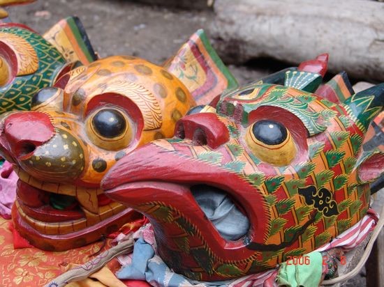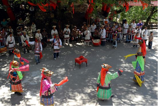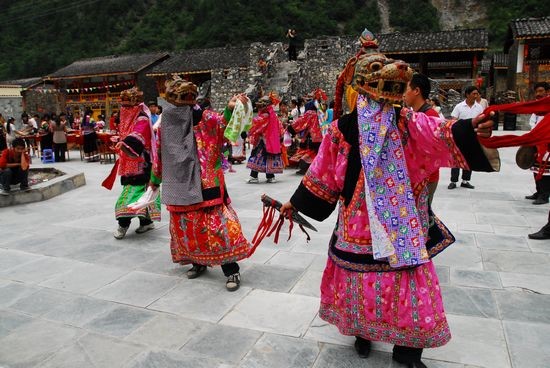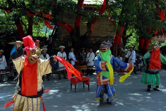 “舞”舞蹈既有祭祀性质又是喜庆节日时人们的娱乐庆祝方式。在舞蹈中既有鬼神又有动物神灵身份,原始粗犷,神秘惊心,有极强的视觉、听觉、心灵震憾力。