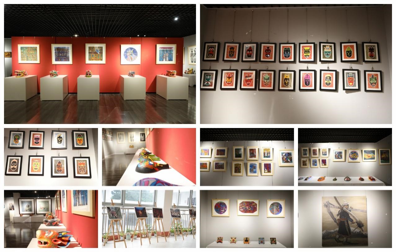 白马人文化艺术研究中心重点展示了中心承担的四川省国培项目研修成果,以非遗传承、研教创新、实践运用及辐射引领等板块进行呈现。本次展出展品300余件,包括白马面具雕刻、刺绣、民间绘画、剪纸、白马题材版画、陶艺、面具彩绘、中国画、油画、白马民俗摄影等作品。