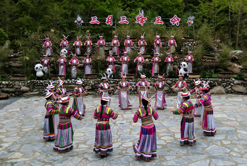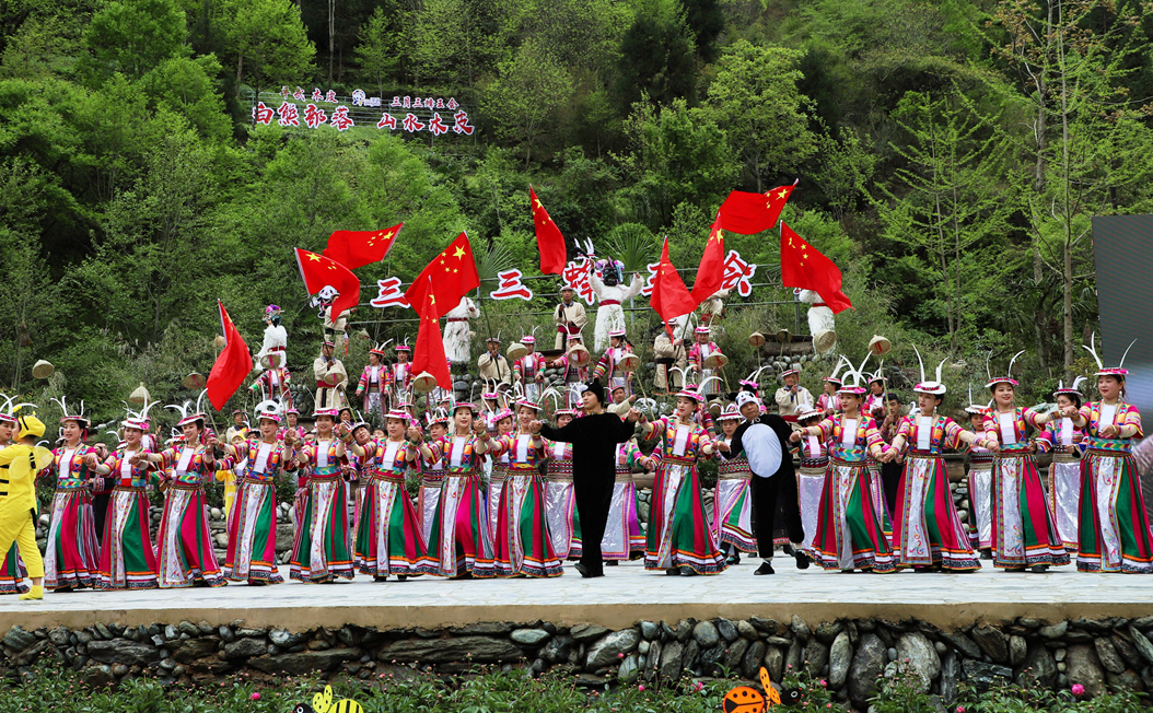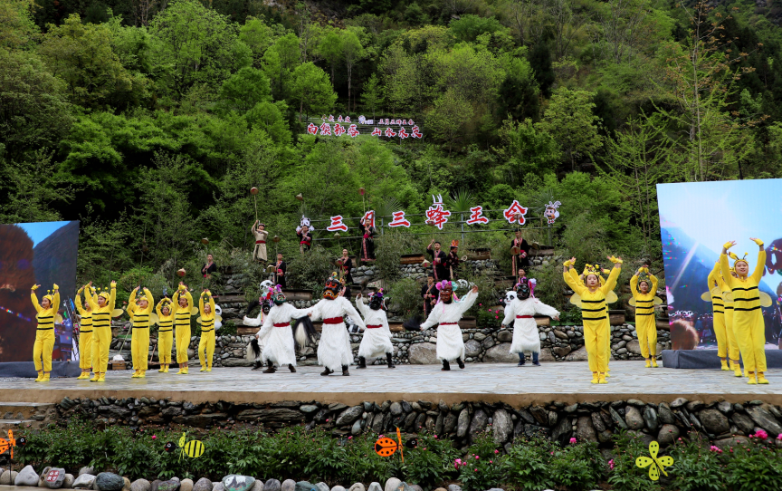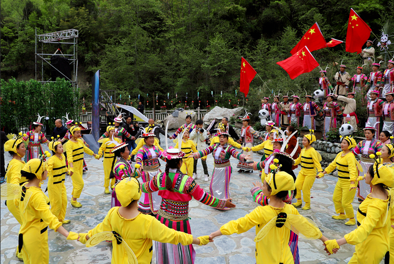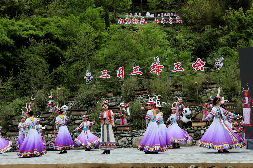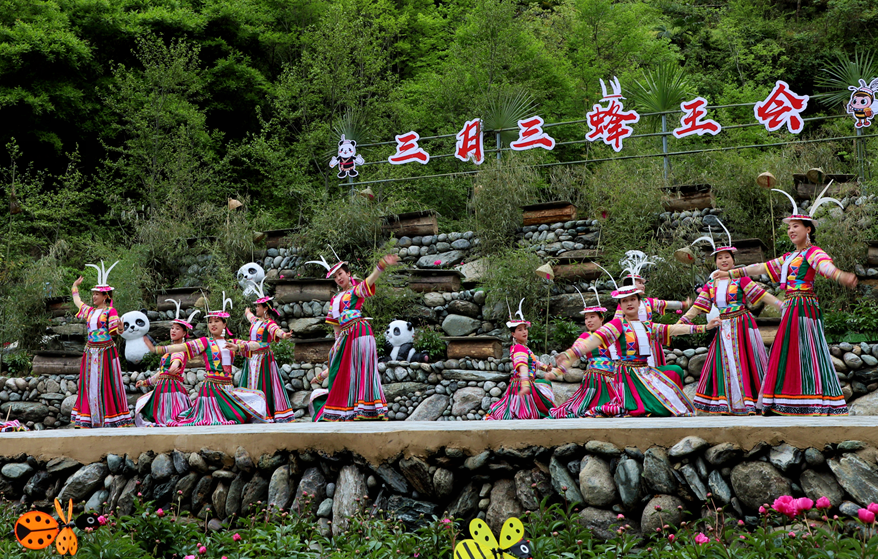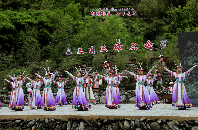 万树喜逢春雨润,百花欣向艳阳开,相聚古老的白熊部落,品味风味醇厚的传统民俗,感受人与自然和谐相处的氛围。4月14日,农历三月三平武木皮藏族乡在关坝村举行蜂王会、蜂王祭祀、白马藏族歌舞、山歌对唱、“熊哥蜂妹”发布...带给观众别具一格的原生态盛宴。以大自然为舞台,以展示白马藏族民俗风情和人与自然和谐相处为主题,一场独具特色的原生态歌舞精彩上演。