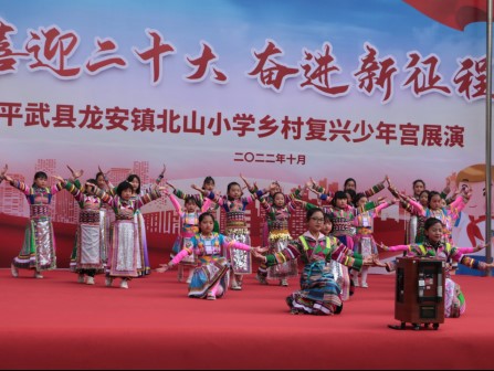 10月10日,平武县北山小学举办了以“喜迎二十大 奋进新征程”为主题的乡村复兴少年宫展演活动,把传统文化、红色文化、白马文化融入立德树人的教育教学活动中,营造诵经典、承文化、颂美德的浓厚氛围。