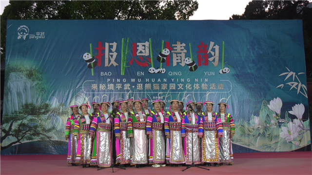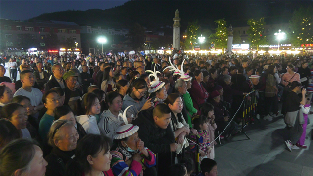 4月15日晚,来秘境平武·逛熊猫家园“报恩情韵”文化体验活动——白马藏族乡专场在报恩寺广场举行。