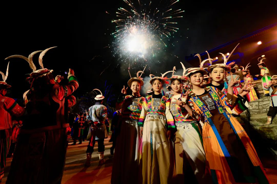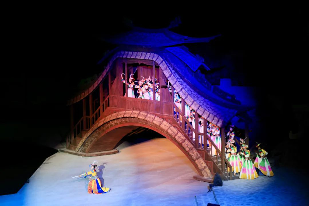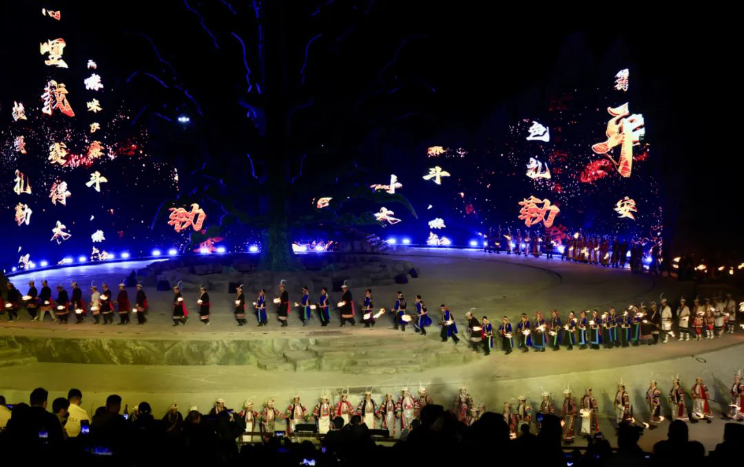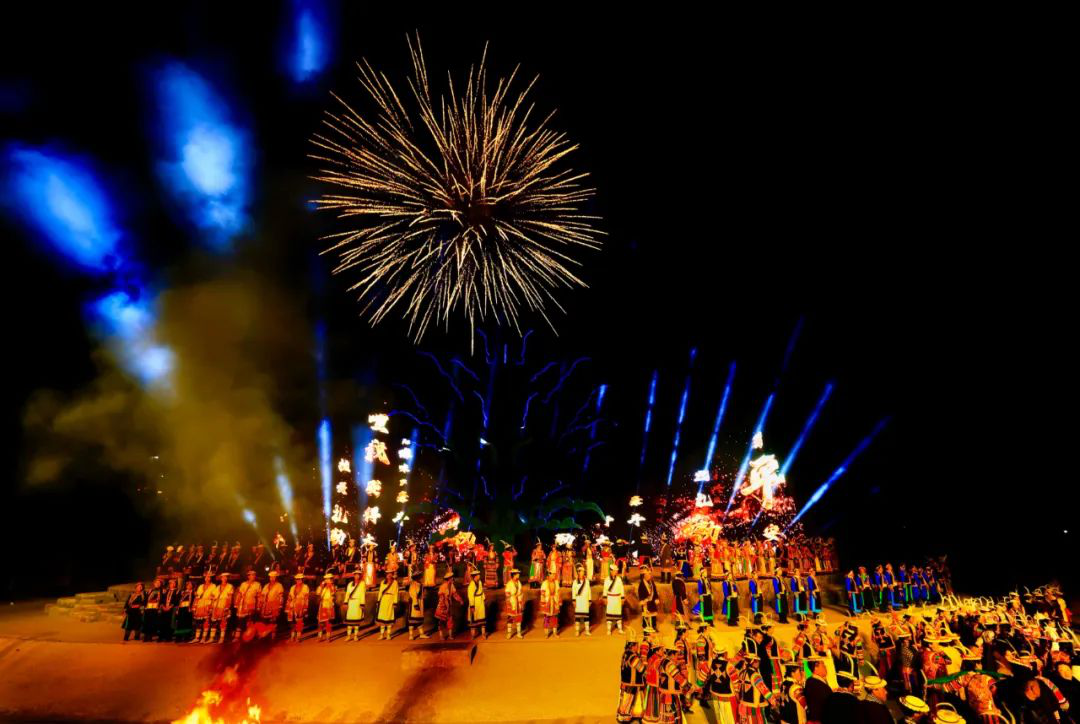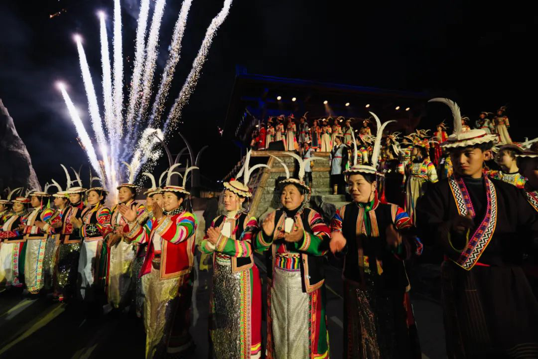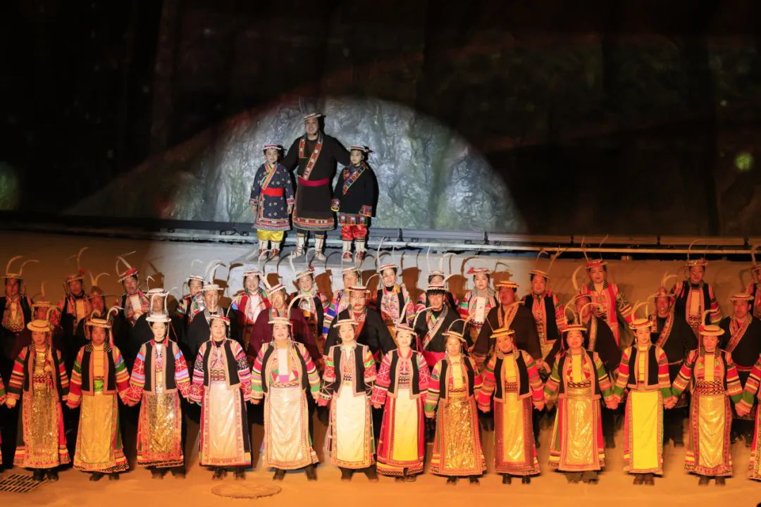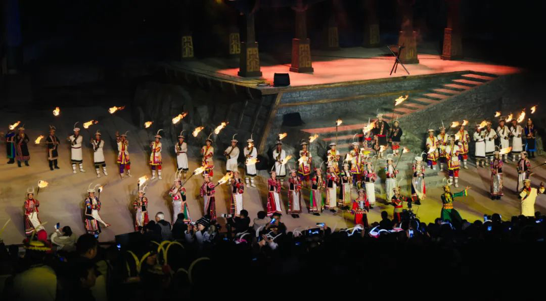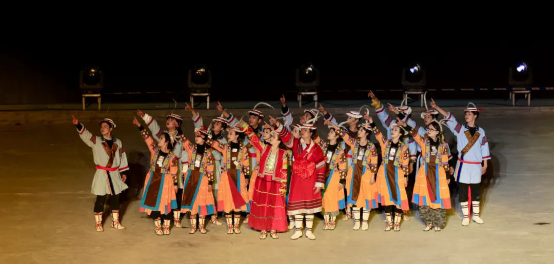 篇章四 圣焰欢腾《圣焰欢腾》篇章将晚会氛围推向高潮,《吉祥火把》和《篝火欢腾》营造出欢乐喜庆的氛围。展现生活在白马山寨的少数民族热情奔放性格的《吉祥火把》,点亮了爱的夜空,火把如龙播撒着吉祥与希望。全体演员参与的《篝火欢腾》,激昂歌声与轻快舞步点燃激情。最后,《吉庆欢送》表达了对宾客的深情厚谊,在悠扬歌声与不舍舞步中,晚会落下帷幕,欢送歌声在白马河畔久久回响、在浓浓夜色中久久回荡。