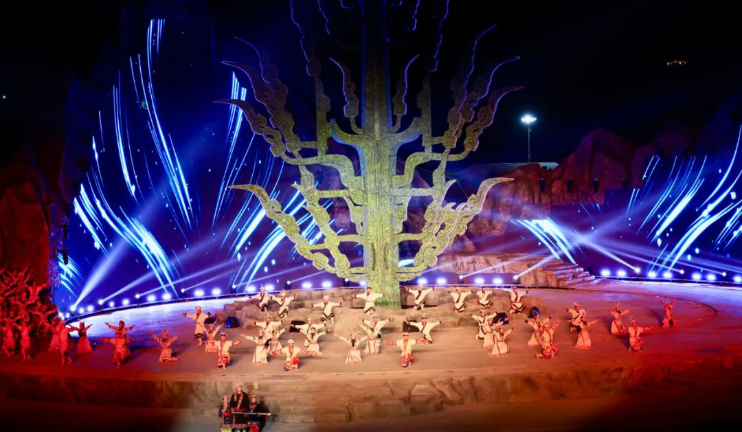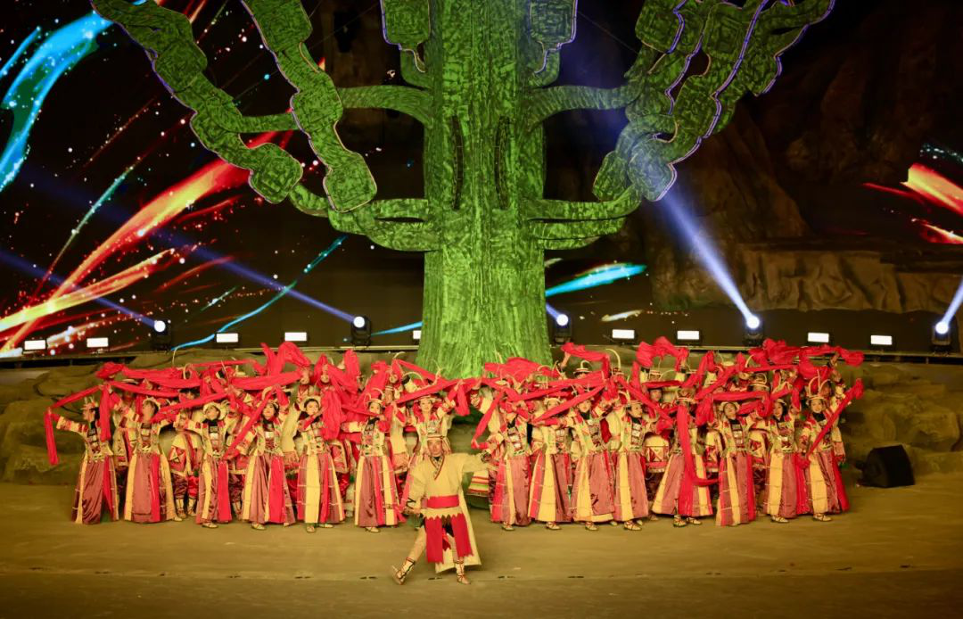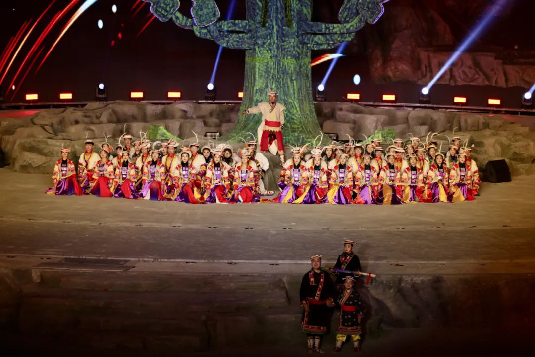 篇章一 迎祥颂吉《迎祥颂吉》篇章,以《酒歌嘹亮》欢迎四海宾客,用《祈福吉祥》“降吉言”,传递美好祝愿。借《阿尼嘎萨》演绎神树之下,一场充满原始古朴韵味的歌舞,讲述英雄的英勇事迹与传奇人生,“人与自然和谐”,表达对自然的敬仰。同时再现生活在白马山寨的少数民族热情好客、心怀敬畏的生活态度,唤醒人们内心深处的共鸣,激励我们共同书写辉煌篇章。